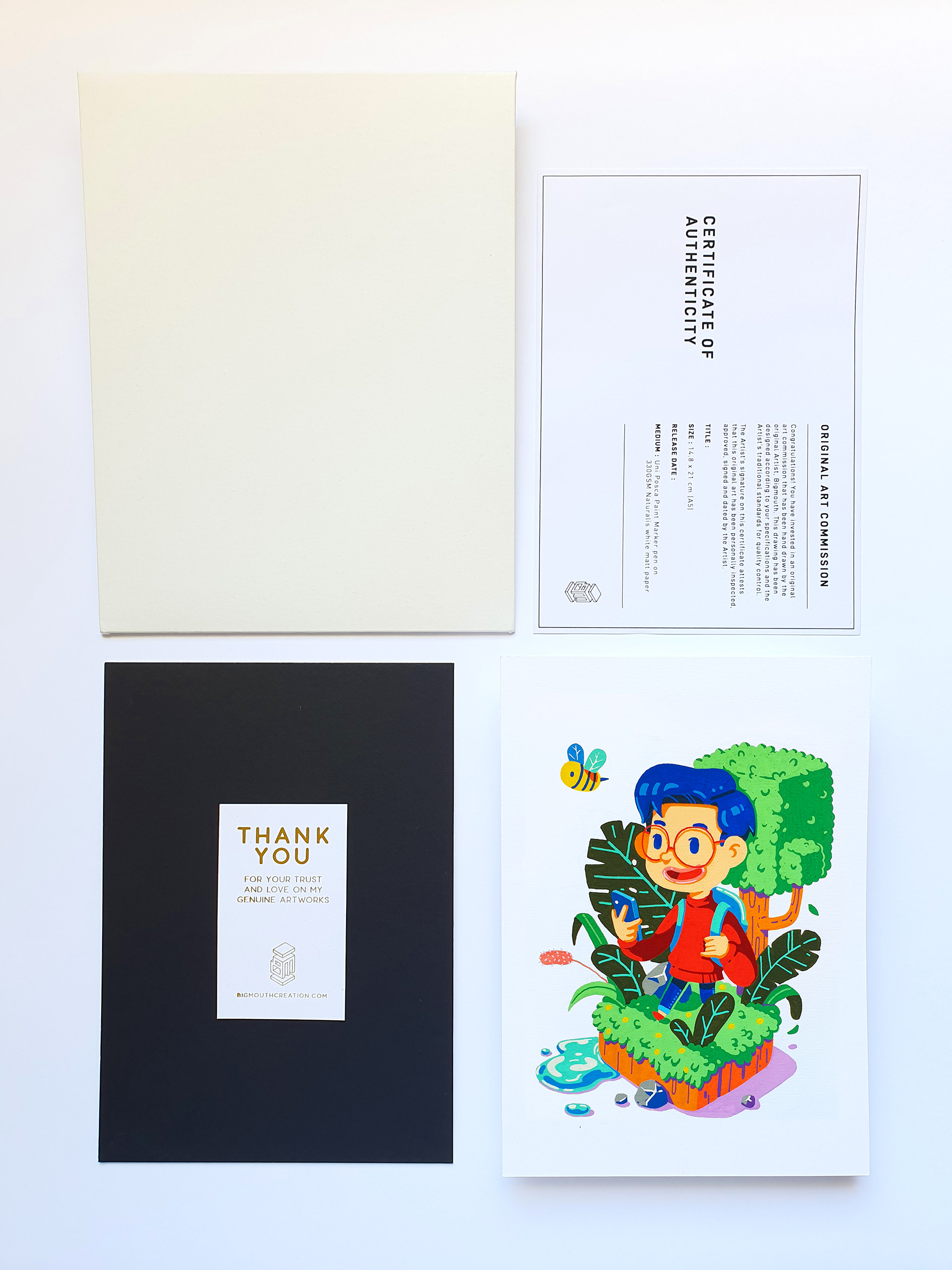 All of the works will signed and protected in a butter paper with a hard cover backing. Then, will be send in a rigid mailer to ensure customers received the goods in best conditions.